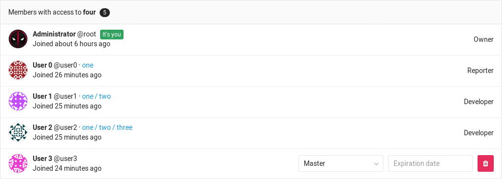 When you add a member to a subgroup, they inherit the membership and permission level from the parent group. This model allows access to nested groups if you have membership in one of its parents.